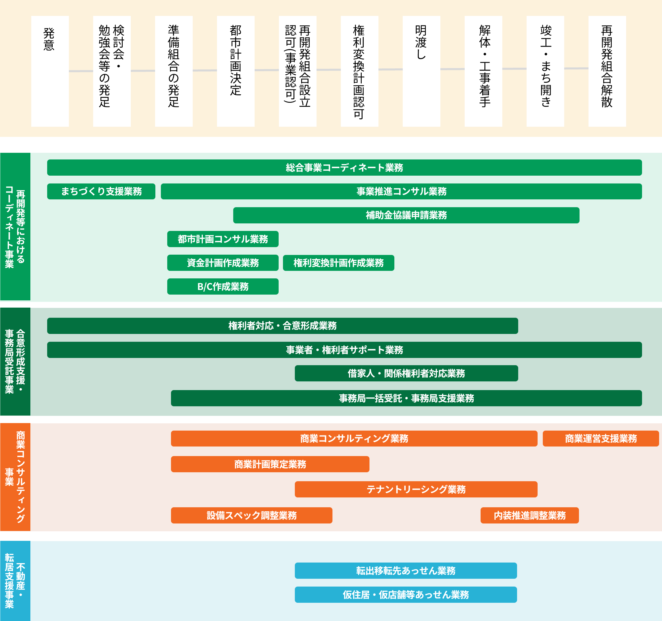 - 再開発事業のほか、マンション建替え事業、優良建築物等整備事業、防災街区整備事業、等価交換事業、TPP事業等の各種コーディネート業務
